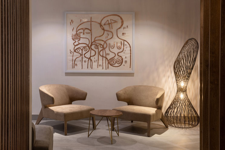 The Deluxe Suite offers guests an elevated experience featuring a king-size bed and a designed living room adorned with bespoke furniture and distinctive African sculptures, which includes a balcony. Visitors can enjoy a complimentary bottle of champagne, enhancing their stay with a touch of luxury.